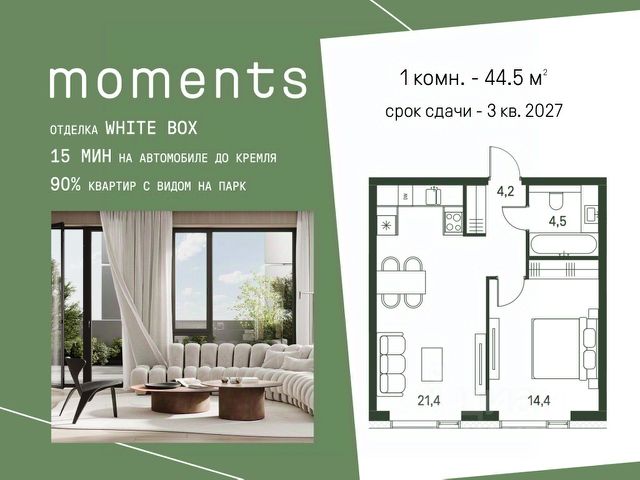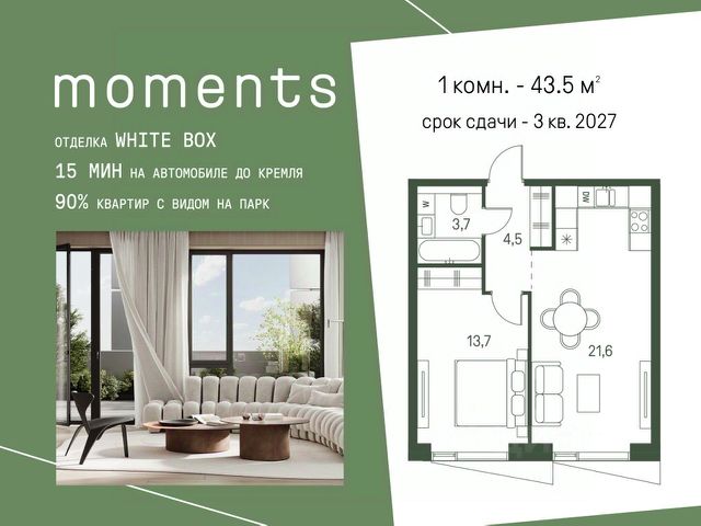 Цены указаны с условием 100% оплаты и стандартной ипотеки. Продается 1-к. квартира номер 301 общей площадью 41.97 кв.м. на 27-м этаже 30 этажного дома, корпус 1. С отделкой White Box. Moments — ЖК бизнес-класса, расположен на расстоянии вытянутой руки от старинного усадебного парка Покровское-Стрешнево. Moments — это единение города и природы, дом, который помогает обрести гармонию и баланс в жизни. Moments расположен на Волоколамском шоссе с удобным выездом в центр и в область, а также с расположенными в пешей доступности объектами транспортной инфраструктуры (МЦК и МЦД-2). Жилой комплекс будет состоять из 3 очередей — 8 корпусов высотой от 4 до 47 этажей. Здания будут расположены под разными углами для максимальной открытости солнцу и максимально роскошным видовым характеристикам. Внутренний двор: Иммерсивное благоустройство от британского бюро Gillespies и West8 сфокусировано на эмоциональном и чувственном опыте. Каждая прогулка по Moments погружает в путешествие со сменой сценариев и плавным потоком уникальных моментов. - Пешеходная экотропа,которая соединяет комплекс с парком Покровское-Стрешнево - Двор с фонтаном - Зеленые сады и лаунж-зоны - Пространства для пикников и общения - Зоны активного отдыха. Детские и спортивные площадки - Пешеходные тропы и велодорожки - Разнообразная коммерческая инфраструктура - Детский сад на 175 мест - Школа на 300 мест - Игровые площадки из натуральных материалов - Сенсорные сады - Безбарьерное зонирование