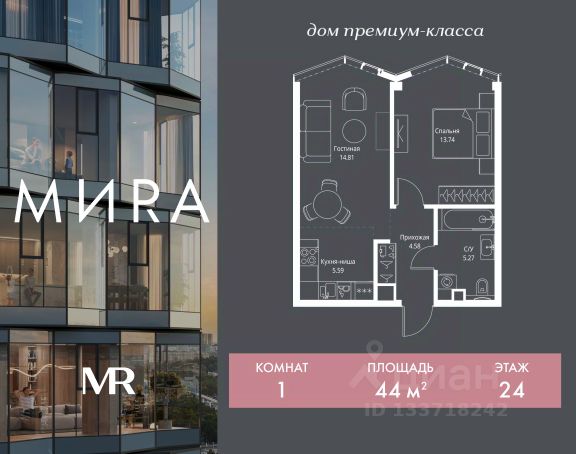 Прямая продажа от застройщика. Продаётся 1-комнатная квартира общей площадью 43.17 м² без отделки в доме премиум-класса МИRА на 24-м этаже 24 этажного дома. Квартира расположена в корпусе 3. Дом премиум-класса МИRA это: • Спокойный район с богатой историей и сложившейся инфраструктурой • Авторская архитектура на стыке классики и современности • Вход в парк прямо из жилого комплекса • Панорамные виды на Яузу, парки, ВДНХ и скульптуру "Рабочий и колхозница" • Удобные сервисы и безопасность для каждого резидента Расположение: Жилой квартал расположен в Алексеевском районе на северо-востоке Москвы, на второй линии домов, таким образом вы сможете дистанцироваться от шума и суеты проспекта Мира, но при этом будете жить недалеко от этой важной городской магистрали. Прямо у дома: • Парк Акведук • Река Яуза • Памятник "Рабочий и колхозница" Пешком: • 16 мин м. ВДНХ На автомобиле: • 12 мин ТТК • 15 мин Садовое кольцо • 12 мин Национальный парк "Лосиный остров" Благоустройство: Концепция благоустройства от бюро "ДРУЖБА" разработана в стиле "Лесная тропа". В уютном дворе расположились словно затерянные в лесу, площадки для отдыха. Они разделяются островками с травами, кустарниками, крупными камнями и деревьями, между которыми проходят узкие песчаные тропинки с деликатной подсветкой по вечерам. Центральной точкой притяжения для жителей станет главная площадь с фонтаном, которая открывается сразу из двух входных групп. Внутренний двор МИRA: • Детская площадка с зонами для игр малышей до трех лет и детей более старшего возраста • Спортивная площадка с профессиональным оборудованием для тренировок • Декоративные перголы • Воздушный арт-объект с подсветкой, похожий на облако • Чайный домик, где в отдельном отапливаемом павильоне можно в любое время года попить кофе с соседями или устроить камерное семейное чаепитие • Зоны для работы и отдыха с гамаком под навесом, скамейками и креслами Инфраструктура и окружение: В Алексеевском районе есть огромные благоустроенные парки, магазины, гимназии с высоким рейтингом и филиалы ВУЗов, частные и государственные детские сады, модные кофейни и фитнес-центры. В квартале МИRА предусмотрены: • 2 ресторана с видом на парк Акведук • 3 кафе • фитнес-студия • подземный паркинг на 330 машино-мест Компания MR предлагает своим клиентам специальные условия приобретения квартир в рамках программ ипотечного кредитования от банков-партнеров.