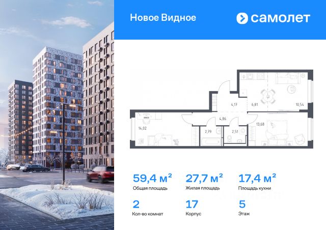 Строим кварталы для жизни с заботой о будущем. Предлагается 2-комнатная квартира комфорт-класса 54,58 кв.м в корпусе 17 на 5 этаже, в ЖК "Новое Видное" Квартира без отделки. Доступность опции "отделка" и возможность комплектации мебелью и декором уточняйте у застройщика. Приобрести квартиру возможно по специальным акциям от застройщика, с текущими условиями акций можно ознакомиться в блоке "Акций". Цена динамическая и может отличаться, уточняйте актуальность у застройщика. Жилой комплекс "Новое Видное" — масштабный проект из 30 урбан-блоков, который находится рядом с Видновским лесопарком и в 8 км от МКАДа. В отделке фасадов — декоративный кирпич в белом, сером, бежевом и терракотовом оттенках. Такое сочетание оттенков словно нежная игра света на песчаной глади озера — тонкие линии и мягкие переливы создают волшебный узор, отражающий красоту природы. Жить здесь легко и комфортно: рядом с домом будет все важное и необходимое — от магазинов и кафе до плейхабов и набережной. В "Новом Видном" вы сможете слушать джазовые мотивы города и наслаждаться освежающей близостью леса. "Новое Видное" — это: 1. До МКАДа — 8 км 2. 20 минут ходьбы или 5 минут на авто до ж/д станции Калинина 3. 25 минут на авто до аэропорта Домодедово 4. В будущем — прямой выезд на Каширское шоссе 5. Видновский парк и Пуговичинский пруд рядом с домом 6. Музей-заповедник "Горки Ленинские" в нескольких минутах на авто 7. 12 минут на авто до конных клубов "Задор", "Юланта" и "Казачий Дозор" 8. 4 школы, 7 детских садов, поликлиника, станция скорой помощи 9. Приватные дворы без машин 10. Покет-парки для спокойного отдыха 11. Спортивные и игровые площадки 12. Входы в корпуса без ступеней и высоких порогов 13. Помещения для колясок в лобби 14. Панорамное остекление балконов 15. Велодорожки по всей территории квартала