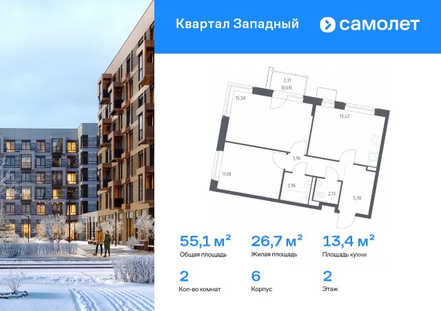 Строим кварталы для жизни с заботой о будущем. Предлагается 2-комнатная квартира комфорт-класса 52,71 кв.м в корпусе 6 на 8 этаже, в ЖК "Квартал Западный" Квартира без отделки. Доступность опции "отделка" и возможность комплектации мебелью и декором уточняйте у застройщика. Приобрести квартиру возможно по специальным акциям от застройщика, с текущими условиями акций можно ознакомиться в блоке "Акций". Цена динамическая и может отличаться, уточняйте актуальность у застройщика. Жилой комплекс в окружении лесопарков и рядом с рекой. До станции МЦД-4 "Санино" можно дойти пешком за 7 минут, а на территории проекта появится транспортно-пересадочный узел с торговым центром. Для жителей построят школу, 2 детсада, в одном из которых будут развивающие кабинеты-трансформеры. Дворы — тихое зеленое пространство без машин. В проекте появится собственный ландшафтный парк с благоустроенной набережной и центральная площадь, на которой будут проводиться различные мероприятия. Высота домов — от 5 до 15 этажей. Фасады выполняют в естественных оттенках, в соответствии с дизайн-кодом "Полевой луг". У каждой секции — свое цветовое решение. Белый цвет верхних этажей добавляет застройке легкости. Фасады облицованы клинкерным глазурованным кирпичом, который используют в проектах бизнес-класса.