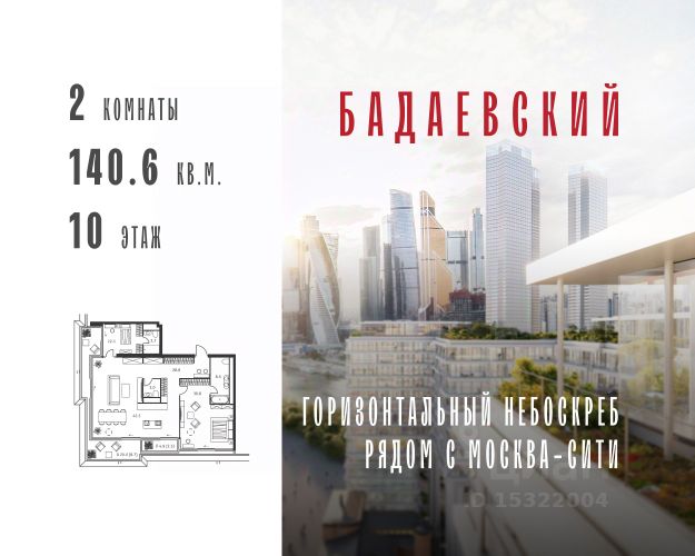 Продаётся 2-комнатная квартира общей площадью 139.70 м² на 13 этаже Жилого Комплекса Бадаевский. О нем говорили. Его ждали. Жилой комплекс "Бадаевский" на Кутузовском проспекте — это место для жизни, которое займет место в истории. Комплекс стал первым в истории московским проектом, победившим в категории Residential на World Architecture Festival. Девелопер Capital Group. В "Бадаевском" исторические здания завода и футуристические "парящие" дома создают единый комплекс, который станет новой достопримечательностью и символом Москвы. Панорамное остекление, террасы и веранды дарят неординарные и захватывающие виды. Благодаря расположению домов и панорамному остеклению, жилые пространства в "Бадаевском" будут наполнены светом. А виды из окон домов-"лент" на Москву-реку, пивоваренный завод, небоскребы "Москва-Сити" и Белый дом дополнены принципиально новым ощущением высоты. На территории Бадаевского завода появится масштабный ландшафтный парк с концепцией "русский лес". Впервые в истории района Дорогомилово у жителей появится прямая связь набережной Тараса Шевченко с Кутузовским проспектом. Близость Москвы-реки добавляет к преимуществам "Бадаевского" природную энергетику и приятные прогулки на свежем воздухе. Подземная парковка позволит сделать территорию завода полностью пешеходной, а сам комплекс представит новый подход к организации открытого и уединенного пространства в центре Москвы. Расположение в начале Кутузовского проспекта делает проект не только престижным, но и удобным: до Третьего транспортного и Садового кольца можно доехать за 5 минут, а Кремль и основные исторические достопримечательности расположены в 15 минутах на автомобиле. Напротив "Бадаевского" находится офисный кластер "Москва-Сити". Для жителей комплекс будет создано не только новое масштабное благоустройство, но и вся необходимая инфраструктура. В исторических корпусах появятся магазины, бутики, кафе и рестораны, коворкинг и крафтовая пивоварня, а в зданиях элеваторов — русская баня. Кроме того, запланирован фермерский рынок и досуговый кластер с музыкальной студией, центром детского творчества и фитнес-центром с бассейном. Купить 2-комнатную квартиру от застройщика Capital Group в Москве.
