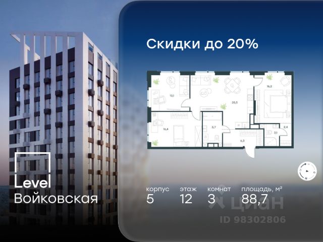Цена указана с учётом скидки при 100%-й оплате, несубсидированной ипотеке, рассрочке (кроме программы "Рассрочка 0%"). Продается 3-комнатная квартира площадью 91.70 кв. м без отделки. Квартира находится на 12 этаже 20-этажного корпуса 3, в новом жилом комплексе бизнес-класса Level Войковская, расположенном рядом с живописным заповедником "Покровское-Стрешнево" (застройщик - компания Level Group/Левел групп). Прекрасная транспортная доступность - 7 мин. пешком до станции МЦК "Балтийская"; - 15 мин. пешком до станции метро "Войковская"; - 8 мин. на машине до ТТК; - 15 мин. на машине до центра Москвы; - 20 мин. на машине до Москва-Сити. Продуманный архитектурный проект - стильная архитектура от мастерской Фефелова В. В.; - панорамные виды на парки, Химкинское водохранилище и Останкинскую башню; - лобби с высотой потолков до 6,45 метров; - более 20 видов планировочных решений, включая редкие форматы квартир с террасой и увеличенной высотой потолков до 5,42 метров; - 2 варианта дизайнерской отделки в корпусе 4, предлагаются как дополнительная опция к отделке white box: стиль Modern в светлых холодных тонах и стиль Classic в нейтральной бежевой гамме. Квартиры в корпусах 3 и 5 сдаются без отделки. Расположение Level Войковская строится в престижном Северном округе Москвы. Развитая инфраструктура и живописная природа переплетаются в единый ансамбль, столь значимый для комфортной жизни. Войковский район окружают парки и набережные. В шаговой доступности - парк "Покровское-Стрешнево", не более 15-ти минут на велосипеде занимает путь до Тимирязевского парка и 9-ти минут до парка усадьбы Михалково. Рядом более 60 школ, 75 дошкольных учреждений, 17 государственных и 6 частных вузов, 25 супермаркетов, 4 торговых центра, среди которых ТЦ "Метрополис" и ТЦ "Авиапарк". Внутренняя инфраструктура На территории жилого комплекса предусмотрены коммерческие помещения: кафе, ресторан, пекарня и другие сервисы откроются на первых этажах корпусов. Для жителей будет доступен отапливаемый подземный паркинг на 244 машино-места с доступом с любого этажа на лифте. На территории паркинга будет расположено 125 кладовых помещений для хранения сезонного инвентаря. Лобби и благоустройство Дизайн лобби Level Войковская создан совместно с бюро BLANK. Это уютные гостиные, где хочется задержаться. Теплая цветовая гамма, ресепшен, зоны ожидания, лапомойки и гостевые санузлы - каждая деталь превращает лобби в комфортное продолжение вашего дома. 1,15 га площади в первых двух этапах строительства отведено под приватный внутренний двор, который спроектирован совместно с бюро "Правда". Детские площадки для всех возрастов, спортивные пространства для йоги, воркаута и петанка, уютные зоны для тихого отдыха или работы. Здесь утро начинается с вдохновения, а вечер наполнен приятными моментами. Лифты Комфортное перемещение внутри жилого комплекса будут обеспечивать надёжные лифты с доступом в паркинг с жилых этажей. В каждом корпусе предусмотрено по 3 грузопассажирских лифта.