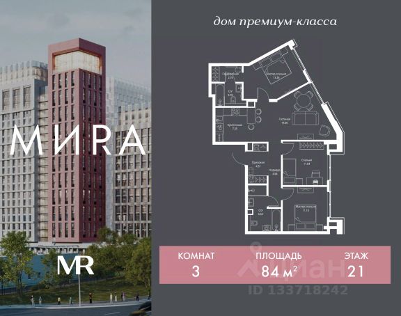 Прямая продажа от застройщика. Продаётся 3-комнатная квартира общей площадью 83.11 м² без отделки в доме премиум-класса МИRА на 3-м этаже 17 этажного дома. Квартира расположена в корпусе 1. Дом премиум-класса МИRA это: • Спокойный район с богатой историей и сложившейся инфраструктурой • Авторская архитектура на стыке классики и современности • Вход в парк прямо из жилого комплекса • Панорамные виды на Яузу, парки, ВДНХ и скульптуру "Рабочий и колхозница" • Удобные сервисы и безопасность для каждого резидента Расположение: Жилой квартал расположен в Алексеевском районе на северо-востоке Москвы, на второй линии домов, таким образом вы сможете дистанцироваться от шума и суеты проспекта Мира, но при этом будете жить недалеко от этой важной городской магистрали. Прямо у дома: • Парк Акведук • Река Яуза • Памятник "Рабочий и колхозница" Пешком: • 16 мин м. ВДНХ На автомобиле: • 12 мин ТТК • 15 мин Садовое кольцо • 12 мин Национальный парк "Лосиный остров" Благоустройство: Концепция благоустройства от бюро "ДРУЖБА" разработана в стиле "Лесная тропа". В уютном дворе расположились словно затерянные в лесу, площадки для отдыха. Они разделяются островками с травами, кустарниками, крупными камнями и деревьями, между которыми проходят узкие песчаные тропинки с деликатной подсветкой по вечерам. Центральной точкой притяжения для жителей станет главная площадь с фонтаном, которая открывается сразу из двух входных групп. Внутренний двор МИRA: • Детская площадка с зонами для игр малышей до трех лет и детей более старшего возраста • Спортивная площадка с профессиональным оборудованием для тренировок • Декоративные перголы • Воздушный арт-объект с подсветкой, похожий на облако • Чайный домик, где в отдельном отапливаемом павильоне можно в любое время года попить кофе с соседями или устроить камерное семейное чаепитие • Зоны для работы и отдыха с гамаком под навесом, скамейками и креслами Инфраструктура и окружение: В Алексеевском районе есть огромные благоустроенные парки, магазины, гимназии с высоким рейтингом и филиалы ВУЗов, частные и государственные детские сады, модные кофейни и фитнес-центры. В квартале МИRА предусмотрены: • 2 ресторана с видом на парк Акведук • 3 кафе • фитнес-студия • подземный паркинг на 330 машино-мест Компания MR предлагает своим клиентам специальные условия приобретения квартир в рамках программ ипотечного кредитования от банков-партнеров. 3-комнатная квартира в ипотеку в новостройке в районе Алексеевский в Москве.