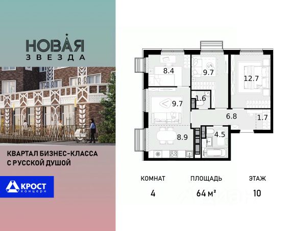 Прямая продажа от застройщика! Продаётся 4-к квартира 64 кв.м. в "ЖК "Новая Звезда"" на 10-м этаже 22 этажного дома.