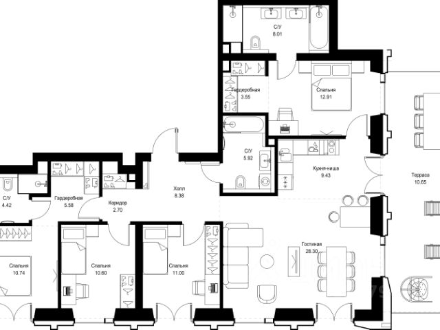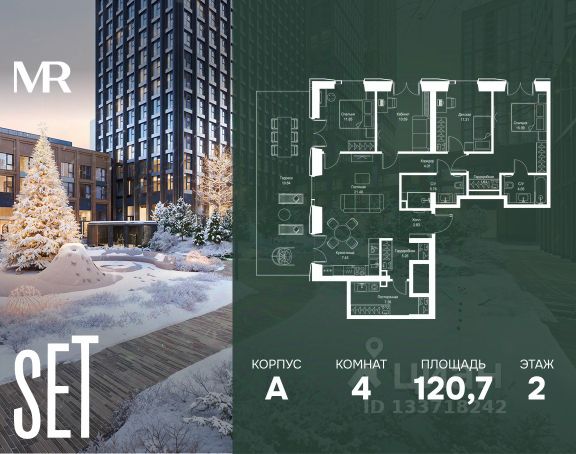 Прямая продажа от застройщика. В ЖК SET продается 4-комнатная квартира площадью 109.63 м², расположенная в корпусе Д, на 3 этаже 5 этажного дома. SET имеет стратегически выгодное расположение в ЗАО, в районе с большой историей и блестящим будущим: между природной зоной долины реки Сетунь и Кутузовским проспектом. В рамках возведения первой очереди предусмотрено три корпуса высотой 18, 45 и 59 этажей. На верхних этажах спроектированы общедоступные смотровые площадки с панорамным обзором на центр столицы. Преимущества проекта: • Функциональные планировочные решения • Контроль проникновения через входную дверь • Система управления освещением и температурой в квартире • Система защиты от протечек с функцией перекрытия воды • Вход в подъезд по биометрическим считывателям Face ID • Скоростные лифты • Двухуровневый подземный охраняемый паркинг на 495 машино-мест Застройка SET включает в себя не только жилые корпуса, но и инфраструктурные объекты. Все необходимое для повседневного комфорта будет расположено в шаговой доступности: • Фитнес-клуб с бассейном • Ведущая городская школа, детский сад и школа искусств • Центр культуры и досуга • Медицинский центр • Кафе и рестораны Расположение комплекса: Пешком: • Метро "Давыдково" - 17 минут • Парк "Долина реки Сетунь" - 3 минуты • Открытие новых станций метро в шаговой доступности в будущем Инфраструктура: Разнообразить свой день резиденты VEER смогут также проводя больше времени на свежем воздухе. Двор разделен на 4 зоны разных эмоций и действий, которые пересечены и соединены веерными прогулочными маршрутами: • Спортивная площадка устроена в глубине ""Кленовой рощи"" • В ""Чайном домике"" будет создан навес с утеплением для отдыха в любую погоду • Площадки для детей воплотятся в ""Волшебный лес"" с цветами, зеркалами и световым дизайном • ""Центральная площадь"" устроена у водного оазиса живописного пруда. " На машине: • "Москва-Сити" - 15 минут • Садовое кольцо - 20 минут • ТЦ "Океания" - 8 минут • ТЦ "Времена года" - 13 минут • Сколково - 12 минут • Гребной канал - 17 минут Компания MR предлагает своим клиентам специальные условия приобретения квартир в рамках программ ипотечного кредитования от банков-партнеров.