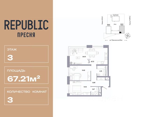 Новая квартира в ЖК "Republic" напрямую от федерального застройщика "Страна Девелопмент". Продается 3комнатная квартира на 8 этаже от застройщика Страна Девелопмент. Площадь квартиры 74,74 кв. м. Стоимость указана без учета акций. Дизайн-квартал "Republic" — новый проект премиум-класса в Москве. 10 жилых башен и 4 восстановленных здания локомотивного депо образуют уникальное пространство. "Republic" — место, где вы ощутите гармонию истории и современности. Детский сад, SPA-комплекс с бассейном, гастрономический и шопинг-центры, собственный бульвар и яркие арт-пространства — для жителей предусмотрены все элементы премиального комфорта. Преимущества Уникальная жизненная среда, где инфраструктура включает гастрономию, SPA-комплекс с термами, образовательные и развлекательные заведения, арт-пространство и шопинг-аллеи. Двор от британского бюро "Gillespies": на 4 гектарах закрытого двора расположится 7 игровых зон для разных возрастов с ручьем и сухим фонтаном, арт-галерея под открытым небом и большой прогулочный бульвар. Лобби с террасой в башнях "Reds" — лаконичное пространство галереи-лобби, где можно проводить деловые и дружеские встречи, не нарушая приватности квартиры. В тёплое время года не остаётся пустующей терраса на крыше, которая привлекает непринуждённой атмосферой и прохладительными напитками в баре. Клубная гостиная — стильное пространство оборудовано кухней и залом для торжеств на 40 человек, а для того, чтобы побыть наедине с собой, почитать книгу или провести онлайн-встречу в гостиной оборудована мастерская с библиотекой. Уникальные форматы квартир, где можно реализовать любой жизненный сценарий: от стильного офиса в двухэтажной квартире до угловых лотов с просторными гостиными. А эксклюзивные пентхаусы с высокими потолками и панорамными окнами дарят захватывающие виды на Москву.. Отделка Квартиры сдаются без отделки или в формате White box. При отделке White box уже были выполнены все шумные и грязные работы руками наших специалистов: произведена разводка электричества с установкой подрозетников, установлены откосы из гипсокартона, устроена стяжка пола с шумоизоляцией. Способы покупки Сотрудники "Страна Девелопмент" будут сопровождать вас на каждом этапе сделки, помогут получить одобрение по ипотеке или снизить ежемесячный платеж. - ипотека - рассрочка - с использованием материнского капитала - 100% оплата наличными