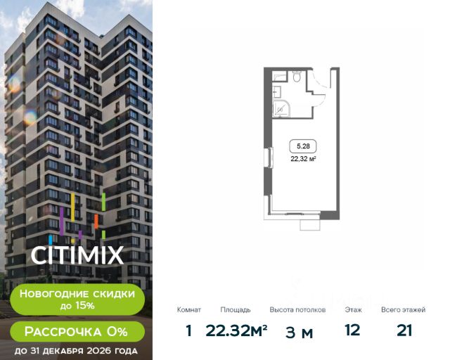 Продаётся студия в корпусе 4, общей площадью 23.49 м², на 12 этаже. Строительство корпуса завершено. Срок ввода — июль 2026 года. В 2026 году запланирован перевод корпуса в жилой фонд, что позволит собственникам оформить постоянную регистрацию в Москве. МФК "CITIMIX" — студии комфорт-класса, расположенные в районе Тропарёво-Никулино в Западном административном округе Москвы. Комплекс включает в себя пять 21-этажных корпусов и собственный парк между ними. Архитектурный облик комплекса, разработанный бюро "ADM", выполнен в современном стиле, а для наружной отделки, уникальной для каждого здания, использовались керамогранитные плиты разных оттенков, витражное остекление и натуральный камень. Все студии в новостройке оснащены современным оборудованием, включая счетчики с возможностью автоматического сбора данных. Во всех подъездах спроектированы уютные лобби-зоны и индивидуальные кладовые. Наличие обширного паркинга, где могут разместиться более 650 автомобилей, позволит закрыть зеленый дворик новостройки для проезда машин и обеспечить жителям уютное, комфортное пространство для семейного отдыха. Первые этажи займут коммерческие помещения, предназначенные для социально-бытовых объектов. В 10 минутах ходьбы расположен парк Школьников, на территории которого есть Очаковские пруды и протекает река Очаковка. В пешей доступности расположен еще один зеленый массив - Тропарёвский лесопарк, занимающий площадь в 218 га. Здесь проложены дорожки для велосипедистов, роллеров и бегунов, обустроены детские площадки и зоны отдыха. Рядом с комплексом находятся детские сады, школа, медклиника, центр развития ребенка, магазины, кафе и отделения банков. Идеальный вариант для студентов, т.к. City-комплекс расположен с такими университетами, как: РАНХиГС, РУДН, РТУ МИРЭА и РНИМУ им. Н.И. Пирогова. МФК "CITIMIX" находится в 1,5 км от станции метро "Озерная" и 2,4 км от станции метро "Юго-Западная. Автомобилистам будет удобно воспользоваться выездом на МКАД (3,2 км). Застройщиком квартала выступает компания APSIS GLOBE, основанная в 2008 году. В качестве девелопера компания успешно завершила ряд инфраструктурных, коммерческих объектов на территории Московской области, Москвы, Санкт-Петербурга.