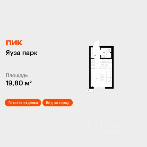 Продаётся квартира-студия площадью 19,8 кв.м на 6 этаже 15 этажного дома (Корпус 13, Секция 1) проекта ПИК Яуза парк. Светлый просторный подъезд на уровне земли, функциональная планировка, большие окна, c отделкой. Жилой квартал "Яуза парк" возводится в Мытищах, в 5 минутах ходьбы от одноимённой ж/д станции. Проект включает 20 домов разной этажности с благоустроенными дворами-парками. Сейчас в квартале началось строительство новых корпусов 7-12. Это отличная возможность купить квартиру по стартовой цене. Индивидуальный дизайн фасадов разработали архитектурные бюро KATARSIS и RHIZOME. Вблизи жилого квартала появятся шумопоглощающие экраны, позволяющие забыть о том, что неподалёку находятся железнодорожные пути. На первых этажах домов откроются магазины, кафе, салоны красоты и другие полезные сервисы. Рядом есть школы и детские сады, магазины и ТРЦ "Красный кит". На территории проекта появится благоустроенная набережная реки Яузы и пешеходный бульвар для прогулок всей семьёй. Водонапорную башню XIX века, расположенную на территории "Яуза парка", мы реставрируем и создадим вокруг неё общественное пространство для отдыха жителей квартала. Для прогулок отлично подойдёт Мытищинский центральный парк культуры и отдыха, расположенный в 10 минутах ходьбы, и Лосиный остров — в 24 минутах. Дорога на автомобиле до Ярославского шоссе займёт не более 3 минут, до МКАД — 10 минут. Артикул 1057457 (Застройщик ООО "Специализированный "НМ-Консалт")