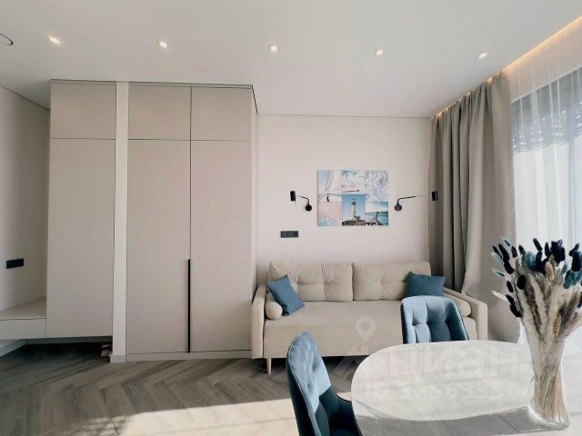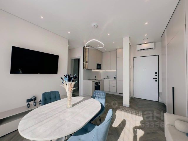 Светлая квартира 43 м² на высоком 20 этаже (потолки 2,8 м): огромная кухня 18 м², жилая площадь 14 м², изолированная планировка, совмещённый санузел с ванной, просторная гардеробная. Полный комплект премиум-техники и мебели: холодильник, посудомоечная и стиральная машины, сплит-системы, теплый пол, водонагреватель, телевизор, интернет, многоуровневое освещение — создана атмосфера уюта и отдыха.