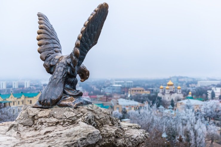 Главный символ не только Пятигорска, но и всего курортного региона Кавказских Минеральных Вод. Скульптуру установили в 1901 году на склоне Горячей горы. Бронзовый орёл изображён в момент схватки со змеёй. По замыслу авторов птица символизирует здоровье, а змея — болезнь.