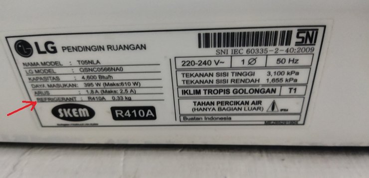 Самый надёжный источник информации о типе фреона — информационный шильдик на внешнем блоке кондиционера, который размещают на боковой стенке корпуса или под защитной крышкой. Среди параметров нужно найти маркировку Refrigerant. Там будут указаны марка и масса заправки в граммах. Фреоны обозначают буквой R и цифрами, например R410a.