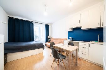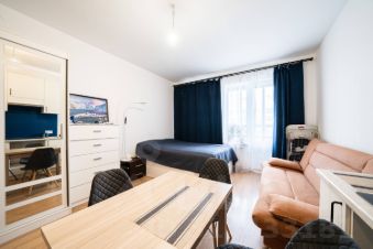 В прямой продаже уютная студия в ЖК "Невские Паруса", площадь 25 метров, плюс лоджия 5 метров. Из мебели остаётся прихожая и мебель на кухне.