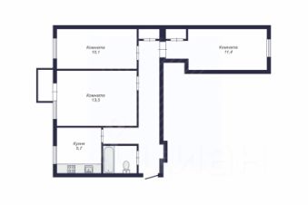 Кухня 5.7 кв.м, комнаты раздельные 13,5 (+ балкон), 10,1 и 11,4 кв.м, сaн.узeл совмещен.