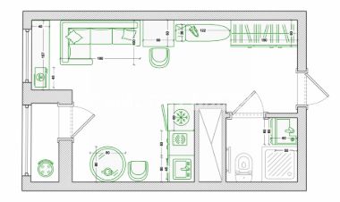 Студия оборудована всей необходимой мебелью, установлен кондиционер, двуспальный диван и просторный гардеробный шкаф.