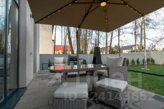 На участке, покрытом рулонным газоном Premium, растут деревья и кустарники. Имеются зоны уличного очага, винный погреб и декоративные природные композиции из камня и растений, крытый навес на 4 авто.