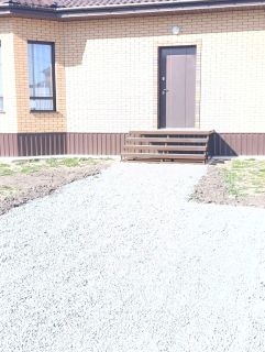 Дом построен в центре участка, 13*9 м., два входа в дом, есть подвальное помещение. Фундамент у дома свайно-ростверковый. Дом построен из сибита + базальтовая плита + облицовочный кирпич.