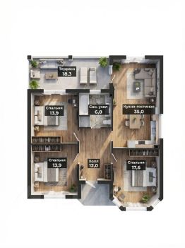 Архитектура и планировочные решения: Дом имеет эргономичную планировку, исключающую неэффективное использование площади. Архитектурная особенность проекта — классический эркер, который придает фасаду премиальный внешний вид. Три изолированные спальни; Просторная кухня-гостиная с выходом на крытую террасу; Функциональная входная группа (прихожая); Совмещенный санузел.