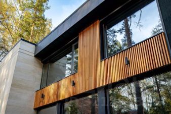 Цокольный этаж отделан рустовкой камнем, а верхние этажи деревянные с элементами фахверка, что очень напоминает домики в альпийских деревнях.