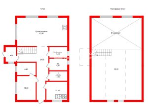 Первый этаж: кухня 20 кв.м., гостиная 29 кв.м., комната 17 кв.м., санузел 5,5 кв.м.
