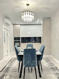 В квартире выполнен дизайнерский ремонт, установлены кондиционеры (сплит-система), полностью укомплектована мебелью и техникой: холодильник, индукционная плита, микроволновая печь, посудомоечная машина фирмы Smeg, духовой шкаф фирмы - Electrolux, осветительные приборы фирмы-Maitoni, диван-Garda Decor, кухонный гарнитур фирмы Мария, смесители и мойка фирмы Omoikiri, мебель фирмы Кардинал, интерьерные элементы и текстиль.
