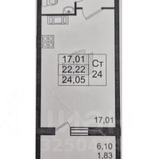Общая площадь 22.2 + 6.1 кв.м. лоджия застекленная, кухня-гостиная 17 кв.м., санузел 2.6 кв.м. совмещенный, коридор 2.6 кв.м., стеклопакеты. Высота потолков 2.6 метра.