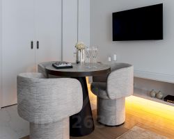 исполнена по эскизам дизайнера, ковры ручная работа, состав - шерсть, шелк (Индия ), установлена система канального кондиционирования, в квартире установлена система климат-контроля в части автоматического регулирования температуры батарей в отопительный сезон, смонтированы теплые полы в санузле, коридоре и кухне, полы - дубовый паркет (Россия), керамическая плитка (Италия), стены краска (США), крупноформатный керамогранит ( Италия), шпон +эмаль, в шкафах предусмотрена подсветка при открытии дверей, бытовая техника