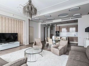 Функциональная планировка: кухня-гостинная с панорамными окнами, две изолированные спальные комнаты, 2 совмещенных санузла, холл.