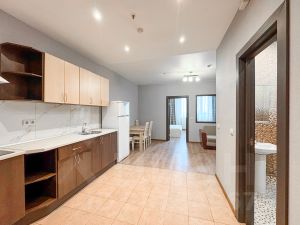 Апартаменты полностью укомплектованы мебелью и техникой. Натяжные потолки, совмещенный санузел с душевой кабиной. Заезжайте и живите — ничего докупать не нужно.
