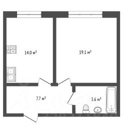 Площадь: 45,1 м², прихожая 7,7 кв.м., кухня-гостинная - 19.1 кв.м., спальня 14, 7 кв.м, санузел 3, 6 кв.м.