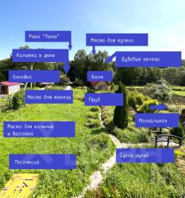Отдельно построена баня (свой септик (экосептик)), также есть зона для организации купели к бане. Установлены гигантские дубовые качели.