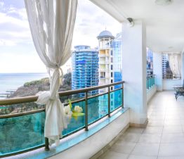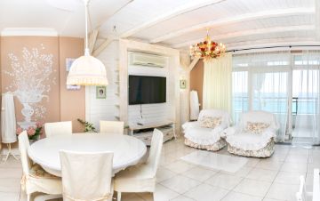 Балкон: с летней мебелью и видом на море.