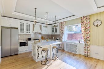 на первом этаже: гостиная с удобными диванами 30 м2 , просторная и светлая кухня - столовая с круглым столом и островом для блюд, ванная с туалетом.