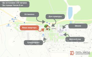 * ИНФРАСТРУКТУРА. Дача находится в живописной зоне Чеховского района, с прекрасной природой. Недалеко располагаются (в 5-ти минутах на машине): детский сад, школа, магазины, супермаркеты, аптеки, рынок. До леса примерно 300 метров. До автобусной остановки 910 метров (примерно 10 минут пешком). До города Чехов можно добраться на автобусе 60. До города Подольск можно добраться на автобусе 61.