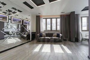 На первом этаже расположены: входная группа с гардеробной; кухня-столовая, гостиная с камином ручной работы и топкой Contura (Швеция); гостевая спальня, санузел, гостевой санузел, прачечная и котельная (оборудована из нержавеющей трубы Valtec, насосными группами Grundfos), а также дублирующим электрическим котлом Kospel и газовым котлом Viessmann. Водоснабжение и отопление выполнены из металлополимерной трубы Rehau Rautitan Stabil. Полы отделаны итальянским полированным мрамором, а также штучным дубовым паркетом высочайшего качества. Теплые полыRehau RAUTHERM, скрытые радиаторы Stout и настенные Arbonia и Kermi. Электрощит собран с использованием оборудования ABB, а вытяжная система - Vilpo. Межэтажная лестница выполнена в Италии, с несущим стальным каркасом толщиной 10 мм, а ступени и перила изготовлены из массива ясеня.