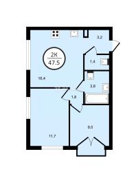 Общая площадь — 47,5 кв. м, из которых 20,7 кв. м — жилая площадь, 16,4 кв. м — кухня.