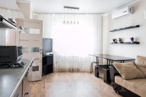 Просторная кухня укомплектована всей необходимой техникой: холодильник, СВЧ. Есть посуда для приготовления пищи и сервировки стола. Из кухни есть выход на открытый балкон с видом на старый Ростов.