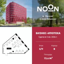 Продается офисное помещение площадью 72.6 м² в бизнес-центре NOON от застройщика Dominanta. ЮВАО, м. Окская Срок реализации проекта - 3 квартал 2026 года. NOON современный многофункциональный бизнес-центр с выразительным обликом, располагающийся в динамично развивающемся районе Москвы. Гостей и сотрудников бизнес-центра встречает яркое лобби с высокими потолками и витражными окнами. На первом этаже располагаются вендинговые автоматы, банкоматы и копировальный центр, где можно распечатать документы. Также здесь находится ритейл с магазинами и кафе. Для мероприятий, презентаций или совещаний в здании имеется конференц-зал. Особая деталь проекта — это эксплуатируемая кровля с озеленением и уютная лаундж-зона с видами на город. Характеристики объекта: - Класс "В" - Функциональные планировки от 63 м2 до 159 м2 - Высота потолков 3,6 м - Окна высотой 3 м с функцией проветривания - Отделка Shеll & Cоrе - 9 этажей - 4 пассажирских лифта - Центральное кондиционирование, отопление и водоснабжение - Приточно-вытяжная вентиляция - Круглосуточная охрана - IP -видеонаблюдение; - Подземный паркинг. Расположение: - 6 минут пешком до ст. м. "Окская"; - 7 минут на машине до СВХ; - 8 минут на машине до МКАД; - 10 минут на машине до ЮВХ; - 12 минут на машине до ТТК; - 16 минут пешком до ст. м. "Рязанский проспект"; - 20 минут пешком до D3 "Вешняки". Звоните прямо сейчас, чтобы узнать подробности!