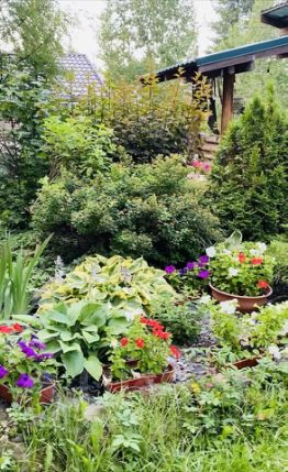 Хосты и прочее ОГОРОД: 1. Теплица стандартная. 2. Кустарники - смородина 1 куст, крыжовник 4 куста 3. Плодовые деревья: 3 ранета.ДОМ: Оформление - обшит корабельной доской красного цвета с белоснежной деревянной резьбой и зеленой крышей 2. Крыша: двускатная под углом 45 гр., остроконечная, не требует сброса снега. 3. Вход: Крыльцо 3 ступени с небольшой верхней площадкой, веранда 1.5х2; входная дверь металлическая + декоративная металлическая