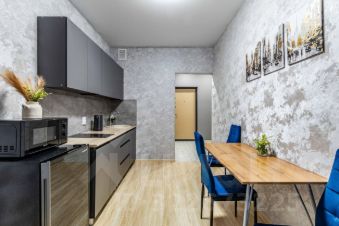 Просторная кухня-гостиная с варочной панелью, микроволновкой, чайником, небольшим холодильником, всей необходимой посудой