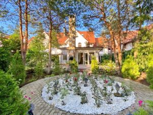 На участке :терраса, оснащенная барбекю , взрослые хвойные деревья . Есть садовый домик . Функционирует система автоматического полива участка. При въезде построен дом для охраны и водителей. В дом заведены центральные коммуникации.