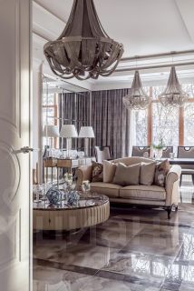 В холле — многоуровневые потолки с лепниной и подсветкой, люстры Terzani, распашные двери 2,4 м по эскизам итальянских мастеров Barausse.