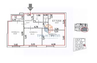 •Все три комнаты широкие, раздельные: 17,2 кв.м. с кладовкой; 12.2 и 14 кв.м.
