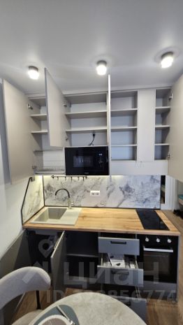 Небольшая, но функциональная кухня имеет вход из гостиной и оснащена всей необходимой посудой и техникой.