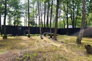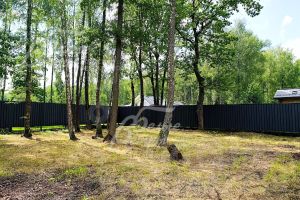 Благоустройство участка: на участке газон, металлический забор из профнастила с трех сторон, фасад из деревянного штакетника высотой 2.0 м.