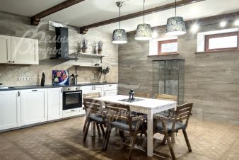 Описание внутренней отделки: отделка в современном стиле минимализма: стены бревенчатые, окрашены; в санузлах плитка; на полах ламинат, в гостиной и в цокольном этаже - плитка; потолки отделаны деревом. Лестница шириной 90 см из массива сосны с деревянными перилами..