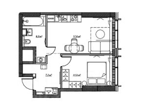 Планировкой предусмотрены 1 комната, просторная кухня-гостиная (17.8 кв.м.), санузел с постирочной, гардеробная.