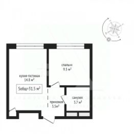 Планировка первого этажа — вход с террасы, прихожая, кухня-гостиная, жилая комната, санузел, ванная комната и сауна.