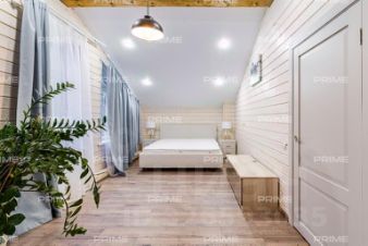 Третий этаж - это мастер-сьют площадью 110 м, созданный, как отдельный мир внутри дома. Просторная спальня с зоной отдыха наполнена светом, а панорамные окна и собственная терраса открывают живописный вид на сад. Две гардеробные, выполненные на заказ, позволяют организовать пространство без компромиссов. Просторная ванная комната выполнена с использованием великолепного мрамора AFYON VIOLET, сантехники GESSI и VILLEROY & BOCH. А ванна, расположенная у панорамного окна, позволяет наслаждаться видом окружающей природы. В спальне - торшер от JNL и бра от EICHHOLTZ, которые создают мягкий вечерний свет, идеально подходящий для чтения или отдыха.