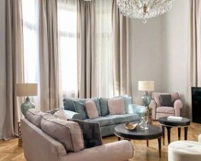 Высота потолков - 5 м в гостиной, 3 м - жилые комнаты