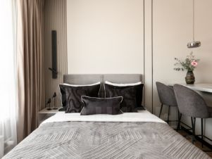 • Спальня/Гостиная: Кровать 140х200 см (HOFF) с ортопедическим матрасом Mediform, две прикроватные тумбы, комод, большой шкаф для одежды, стол для работы/обеденный, стул и кресло, стеллаж.